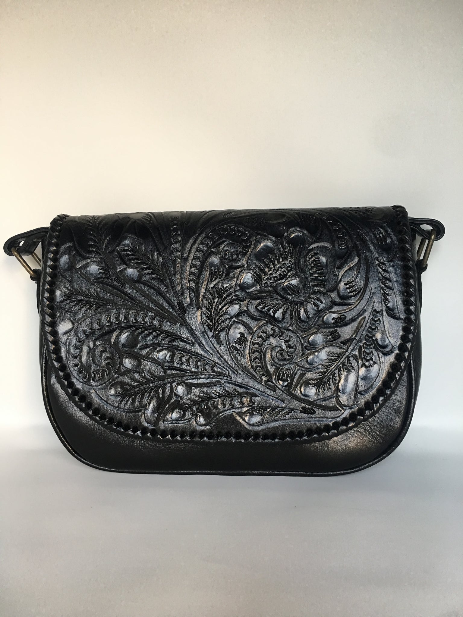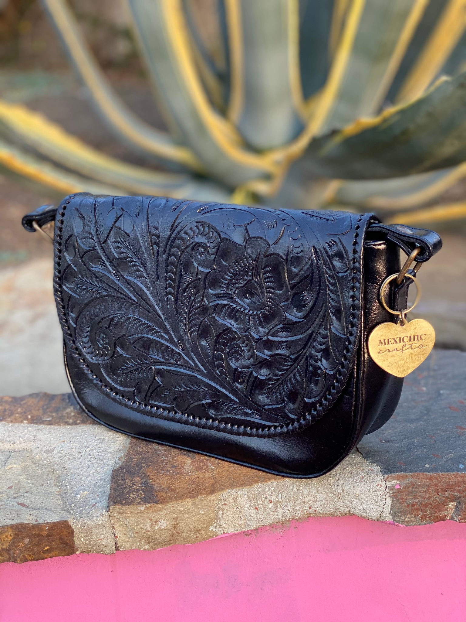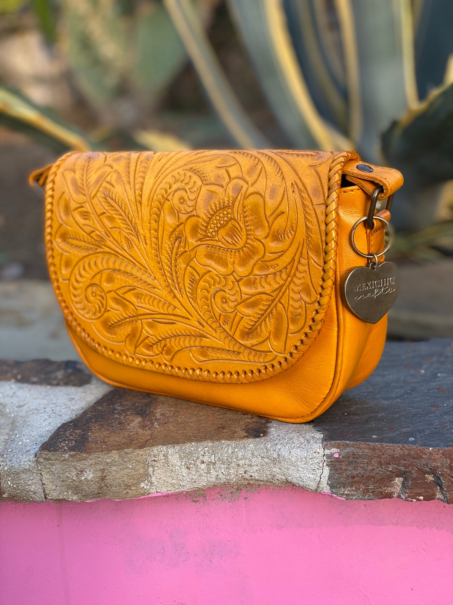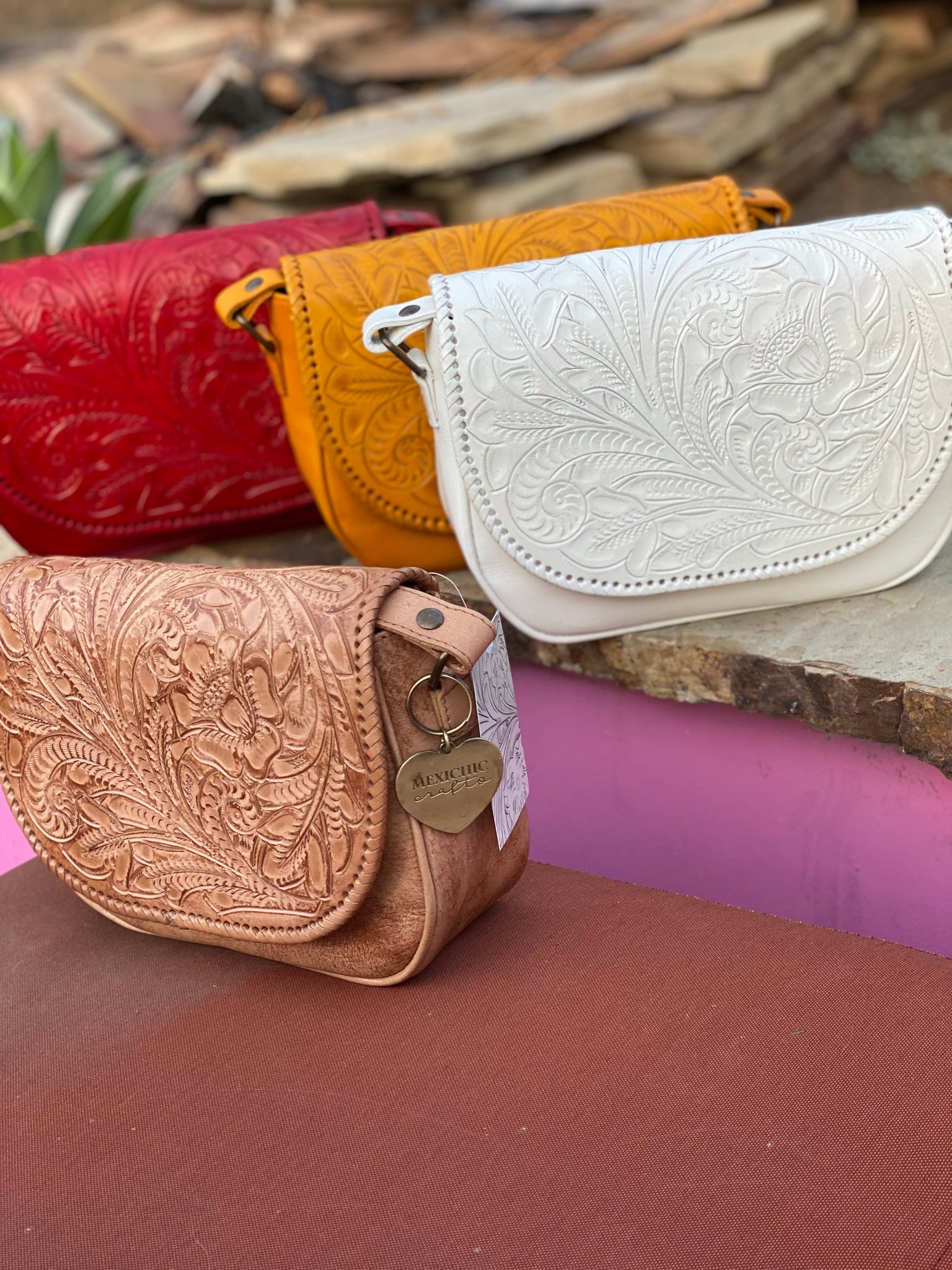 ESTRELLA is traditionally fun!  Hand-tooled leather cross-body handbag. Inside lined with suede leather.