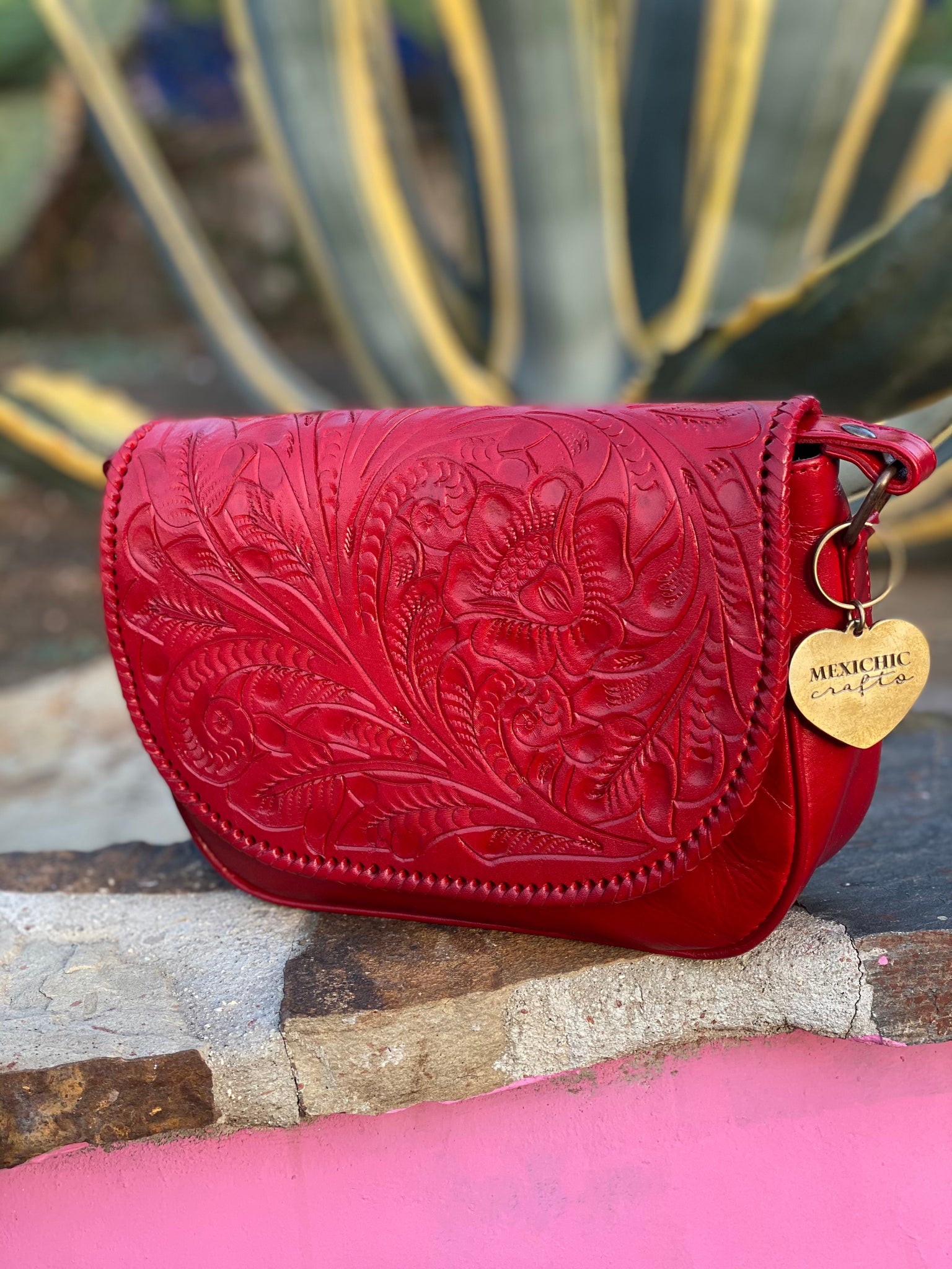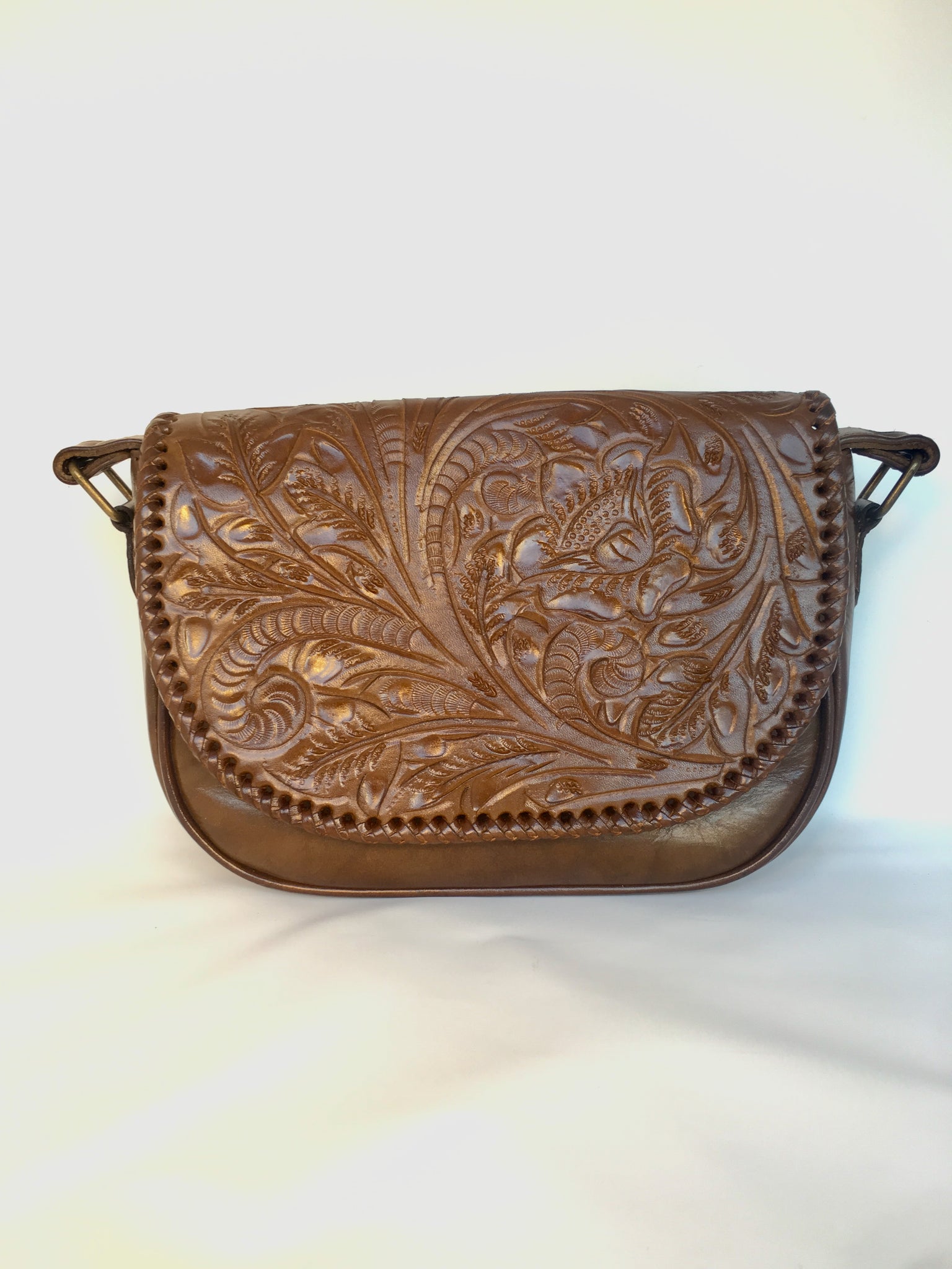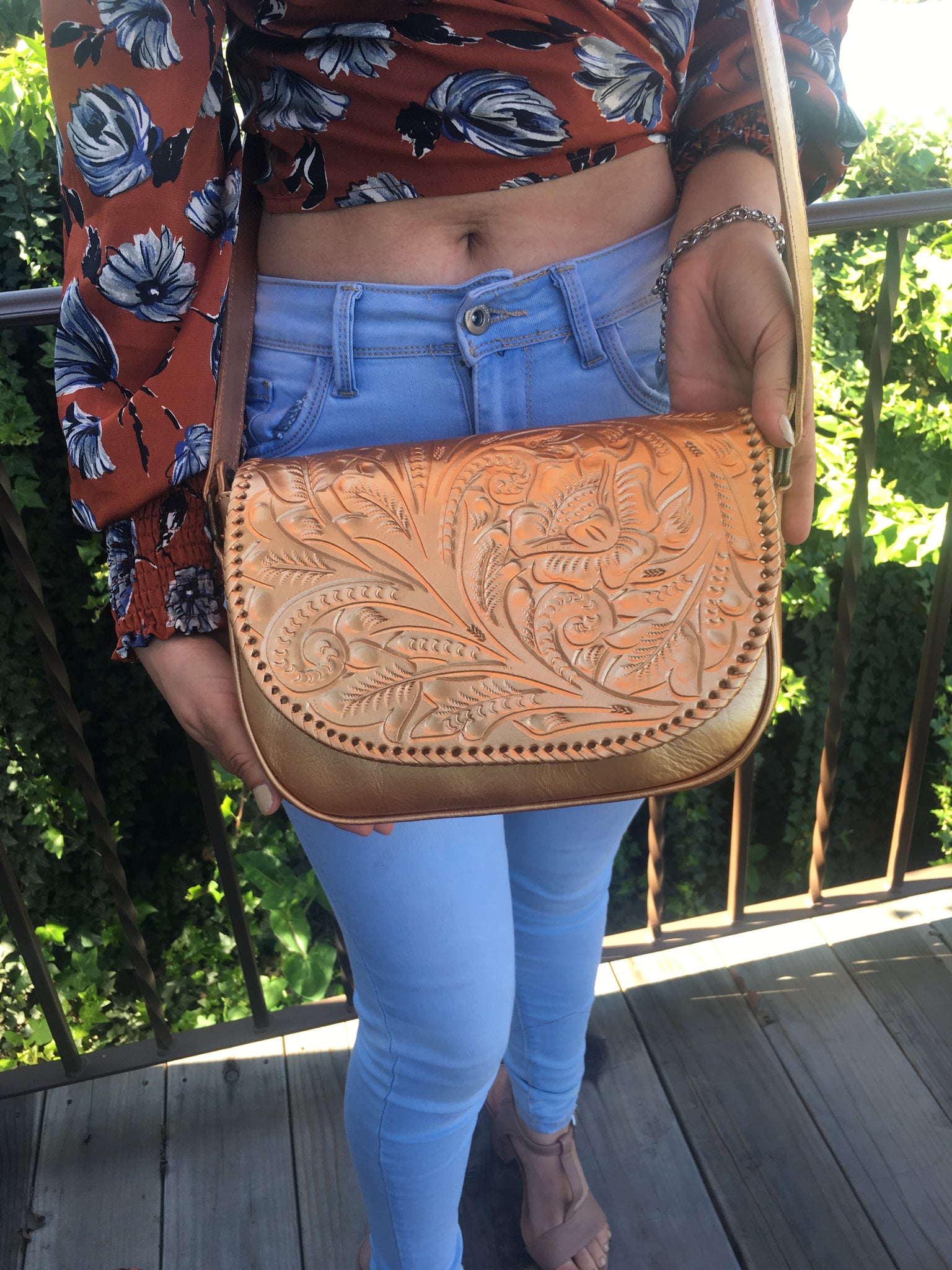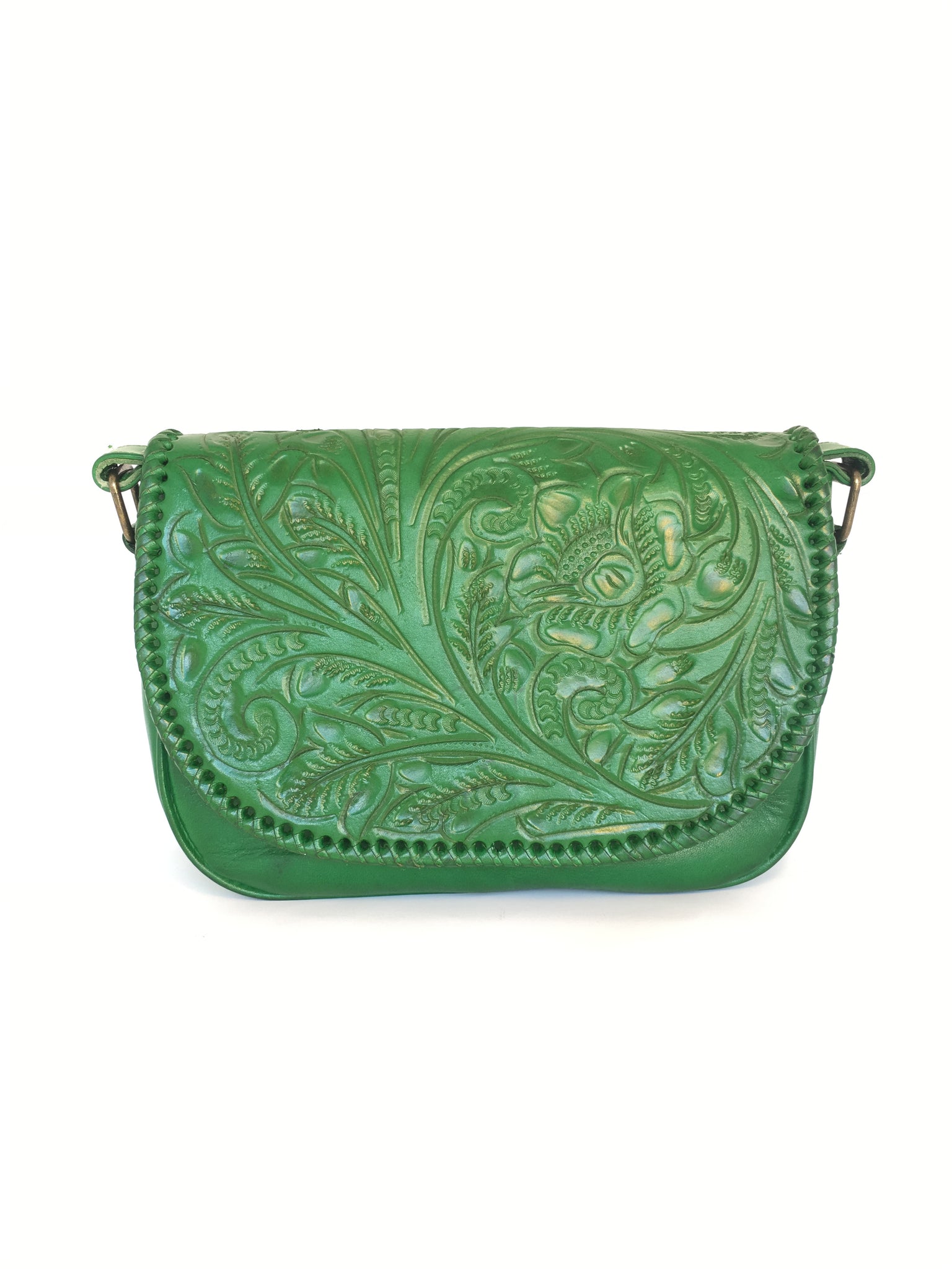 ESTRELLA is traditionally fun!  Hand-tooled leather cross-body handbag. Inside lined with suede leather.