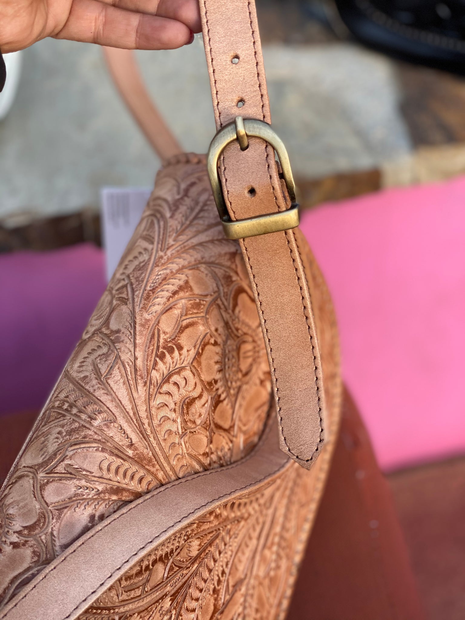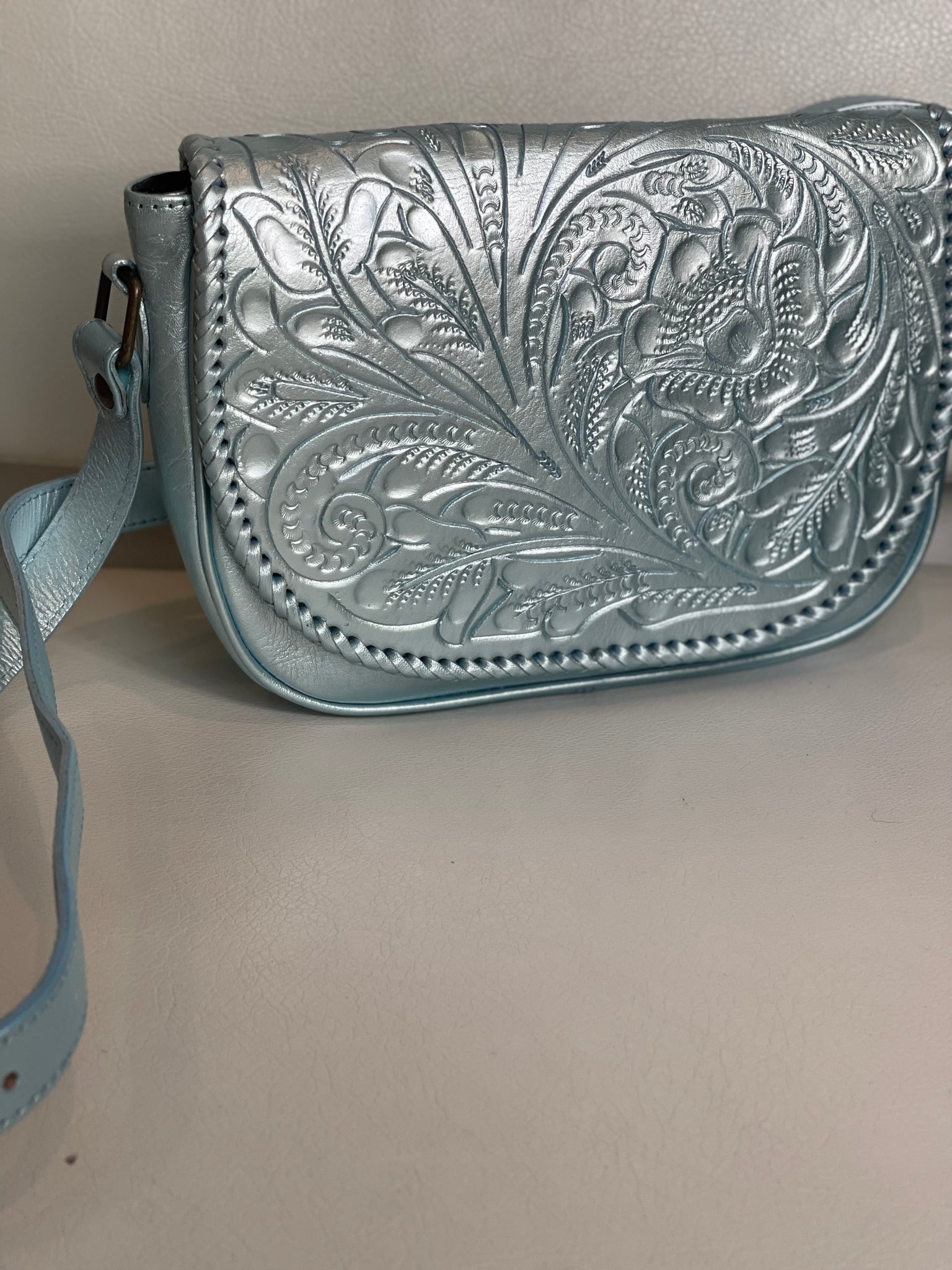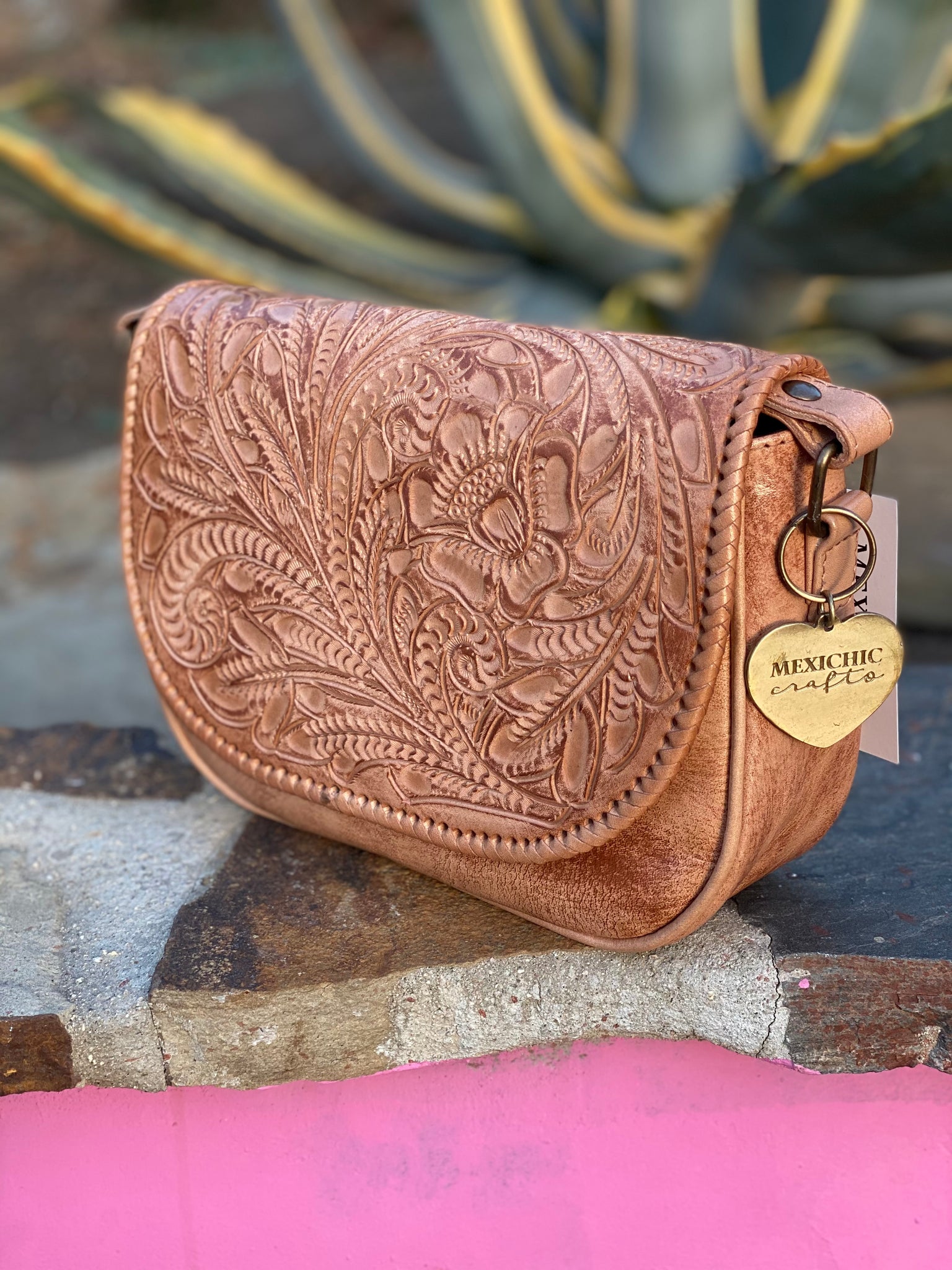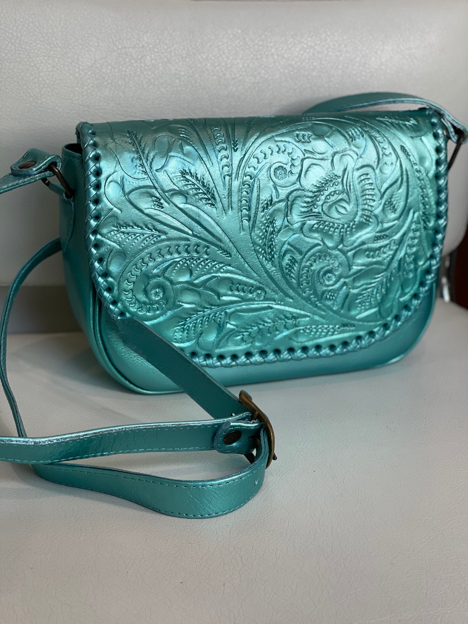 ESTRELLA is traditionally fun!  Hand-tooled leather cross-body handbag. Inside lined with suede leather.