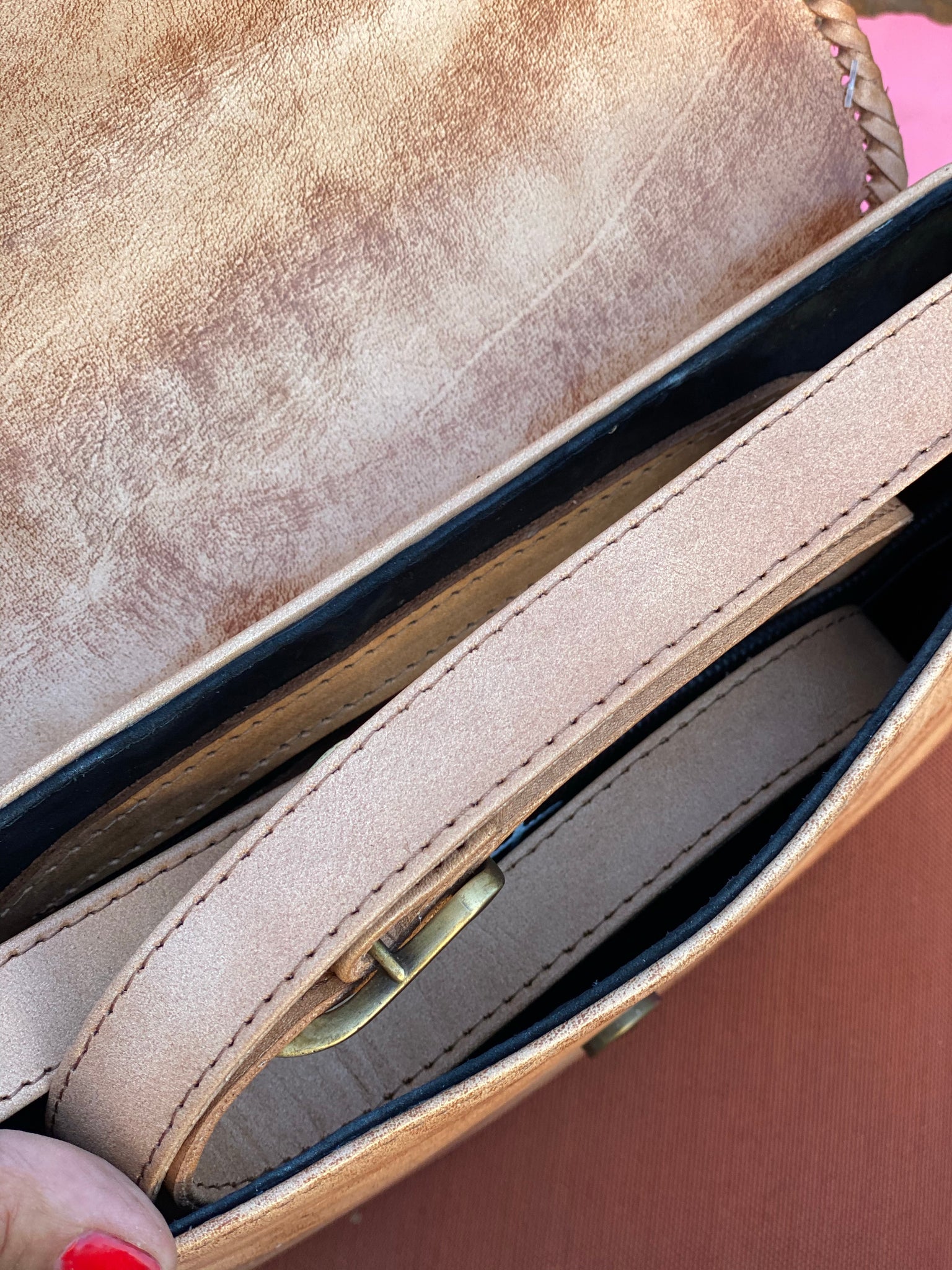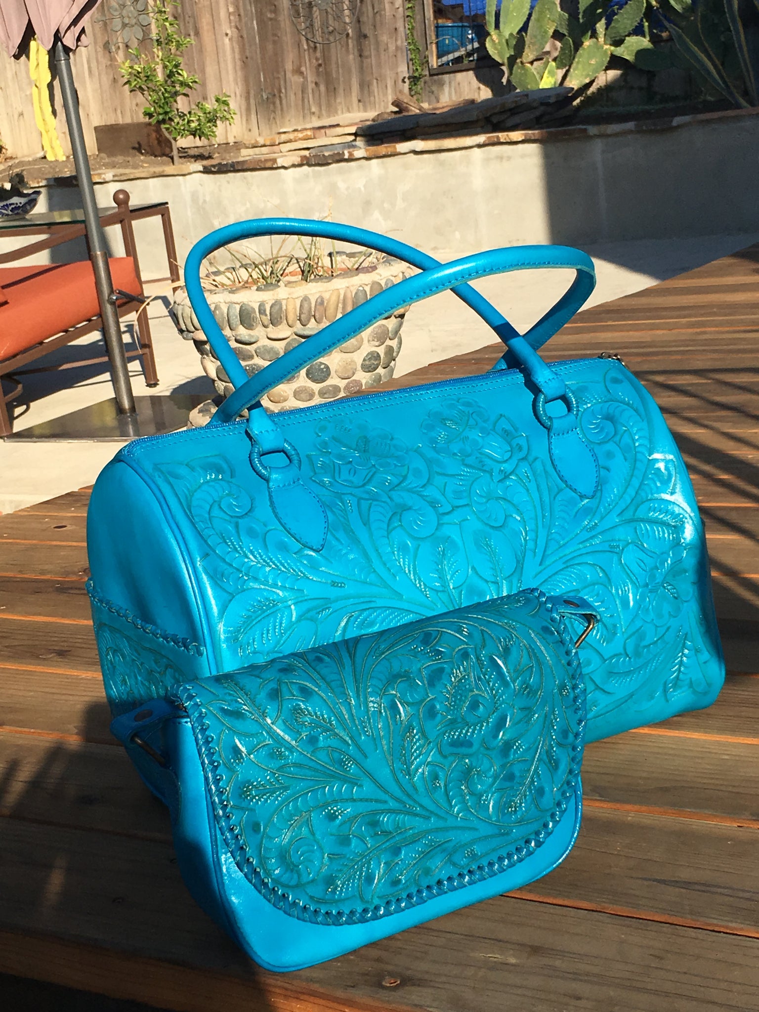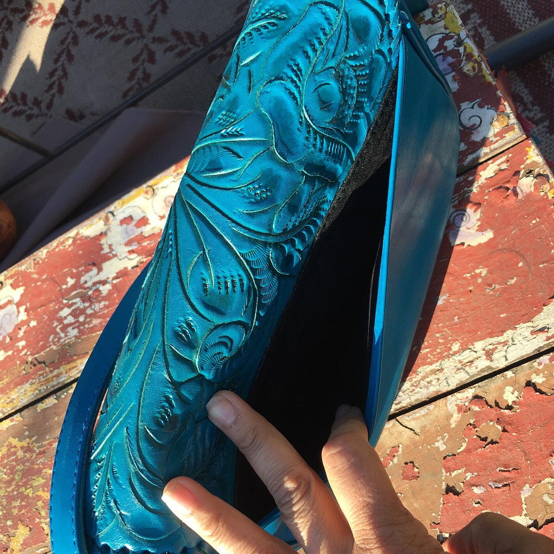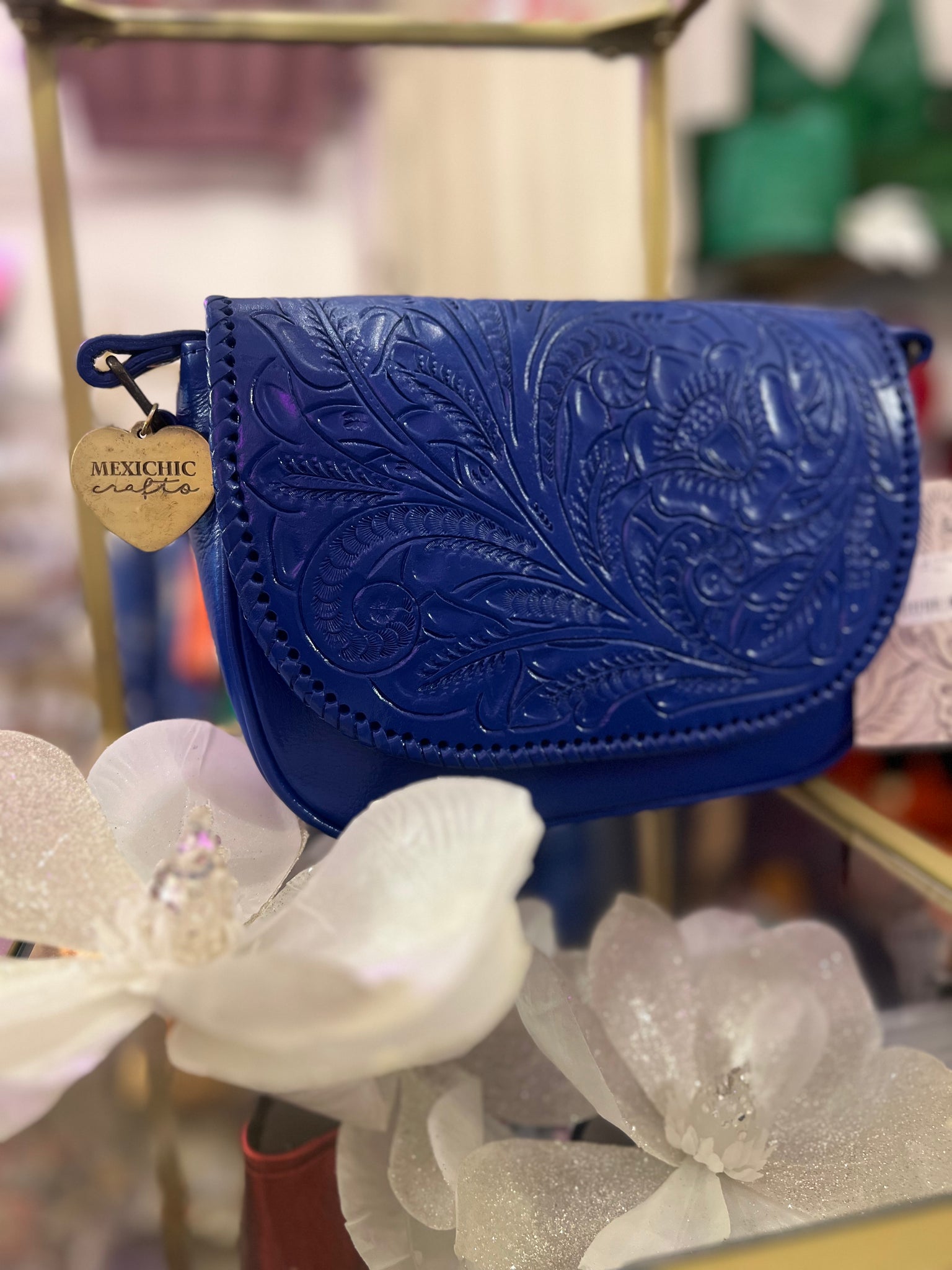 ESTRELLA is traditionally fun!  Hand-tooled leather cross-body handbag. Inside lined with suede leather.