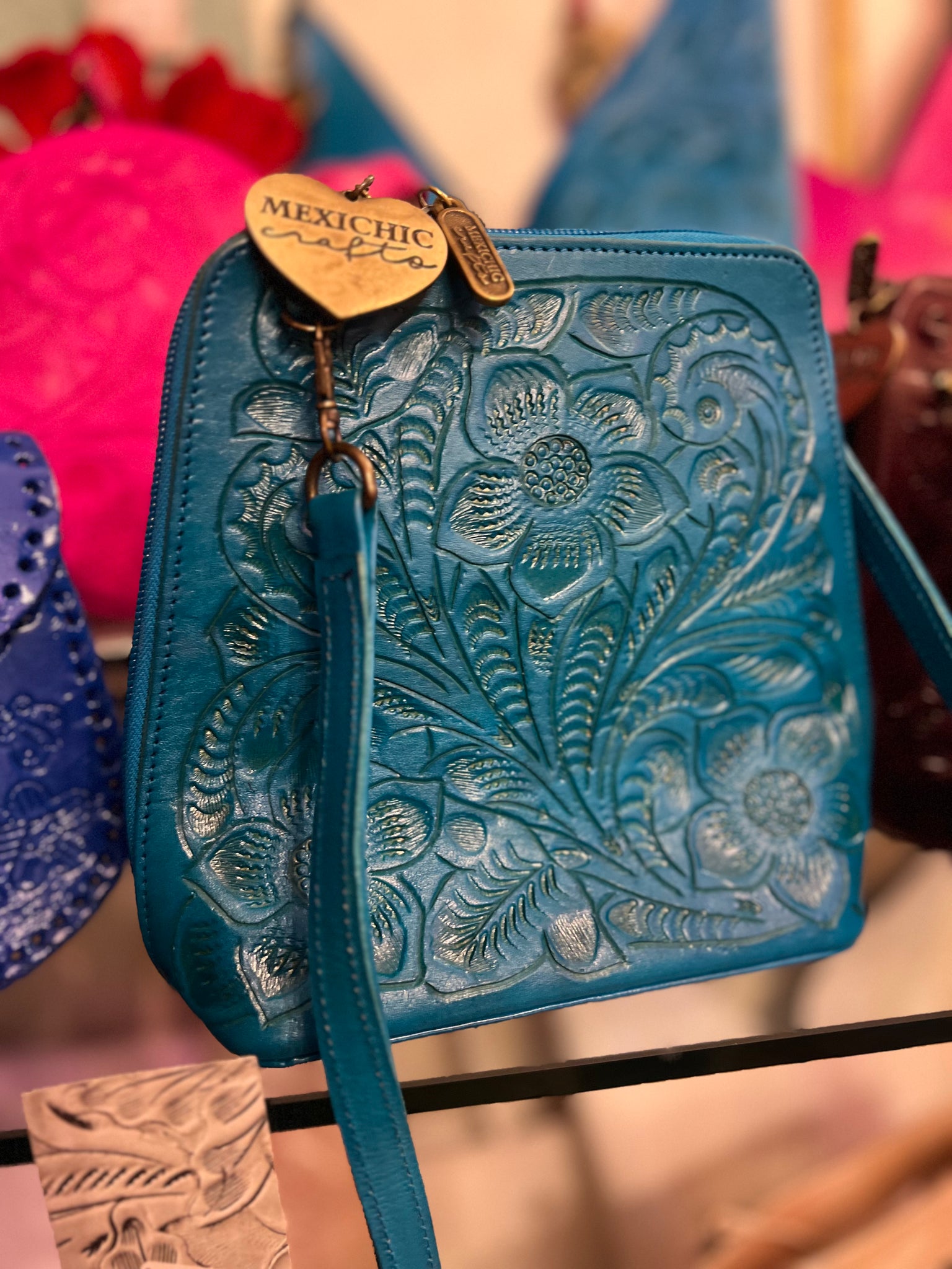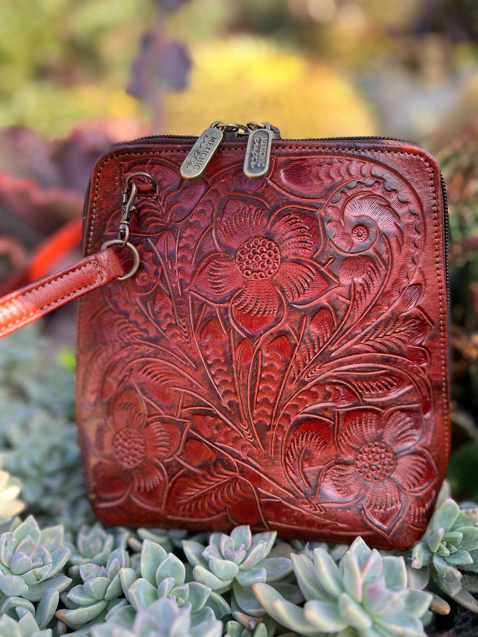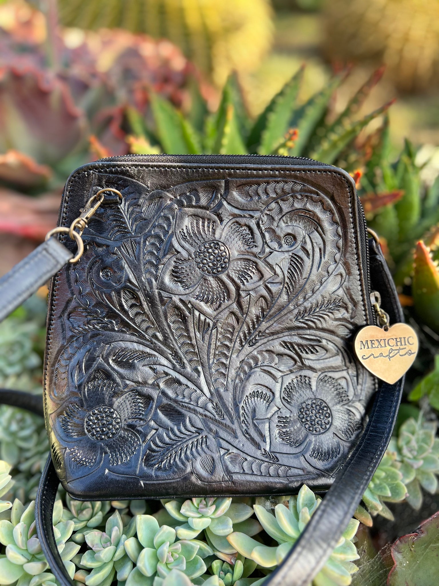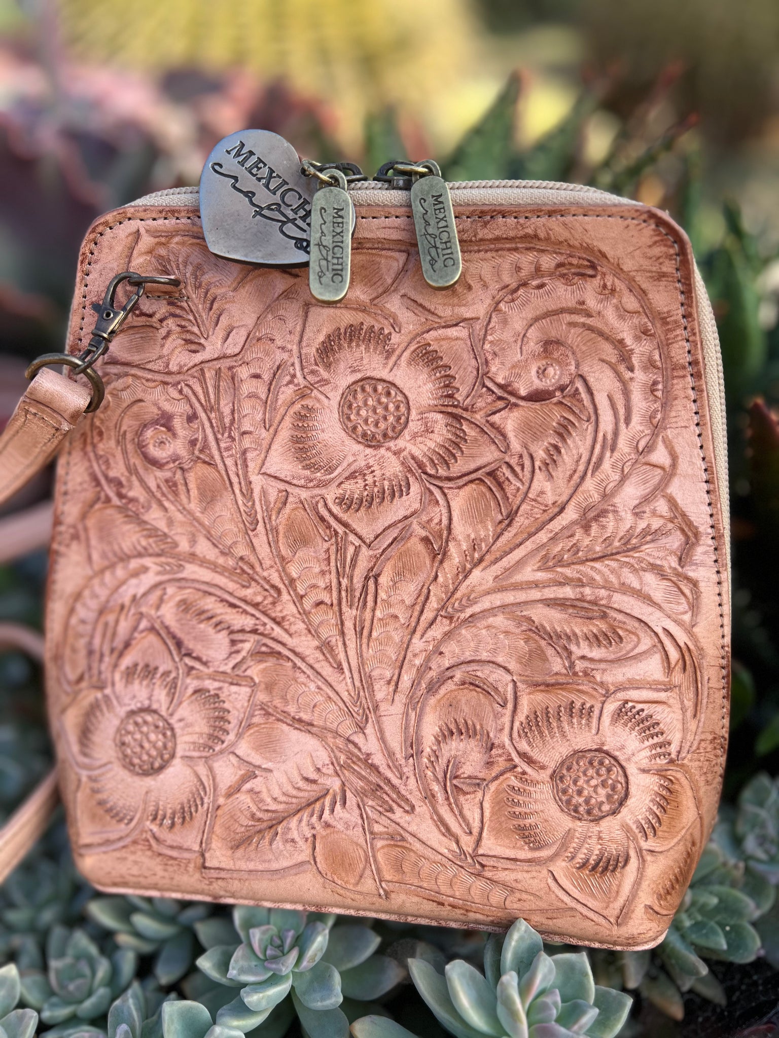 HILDA SOLIS is hand tooled, lined with suede. Opens wide and comfortably. Inside middle secure zipper compartment. Back zipper access pockets. Adjustable strap. .