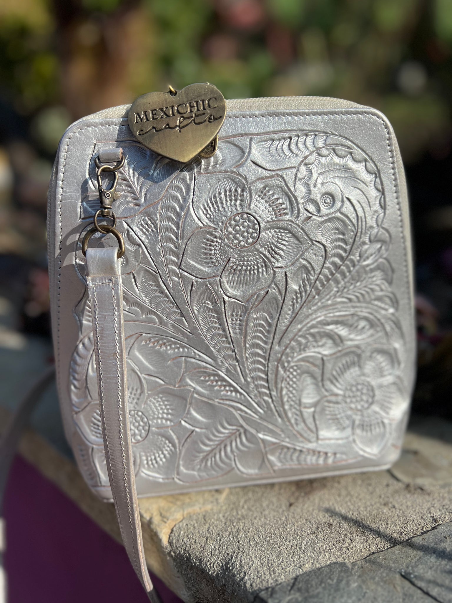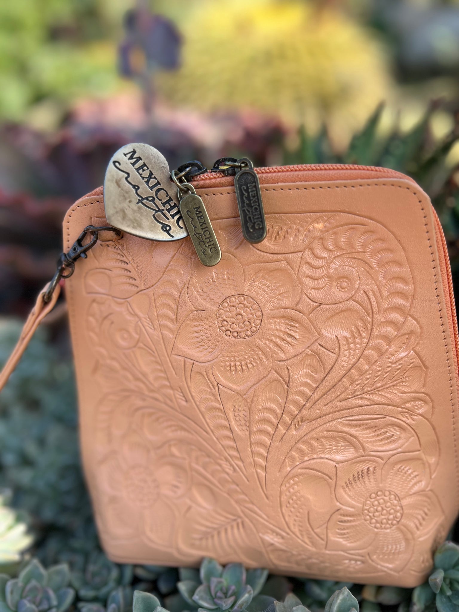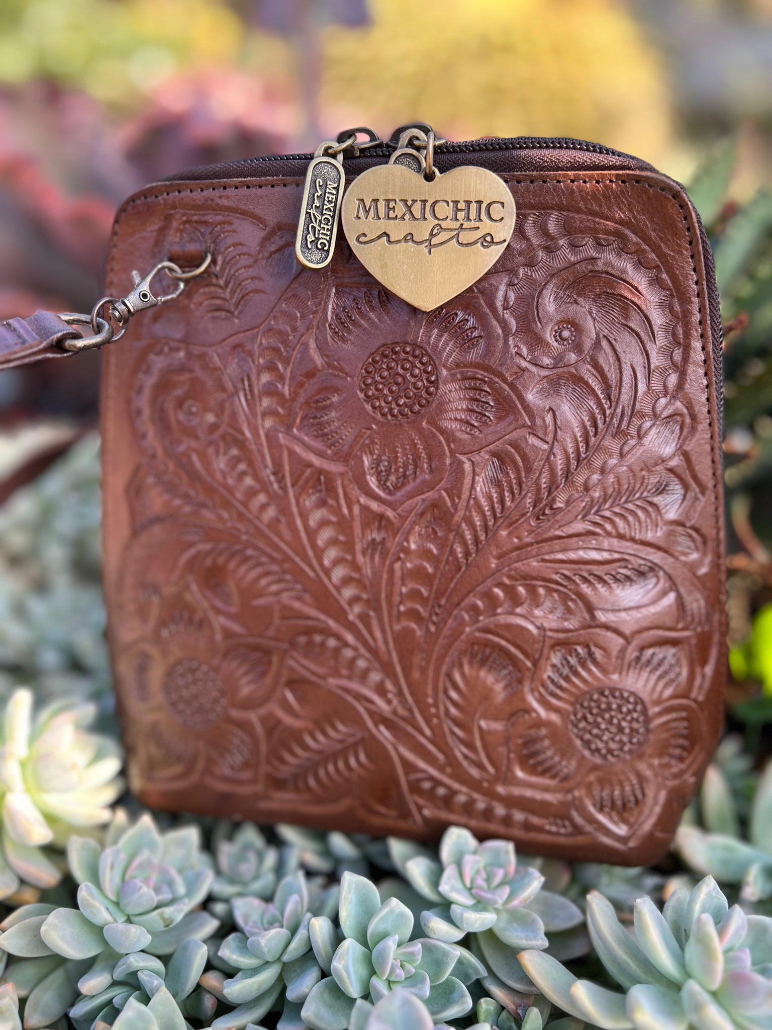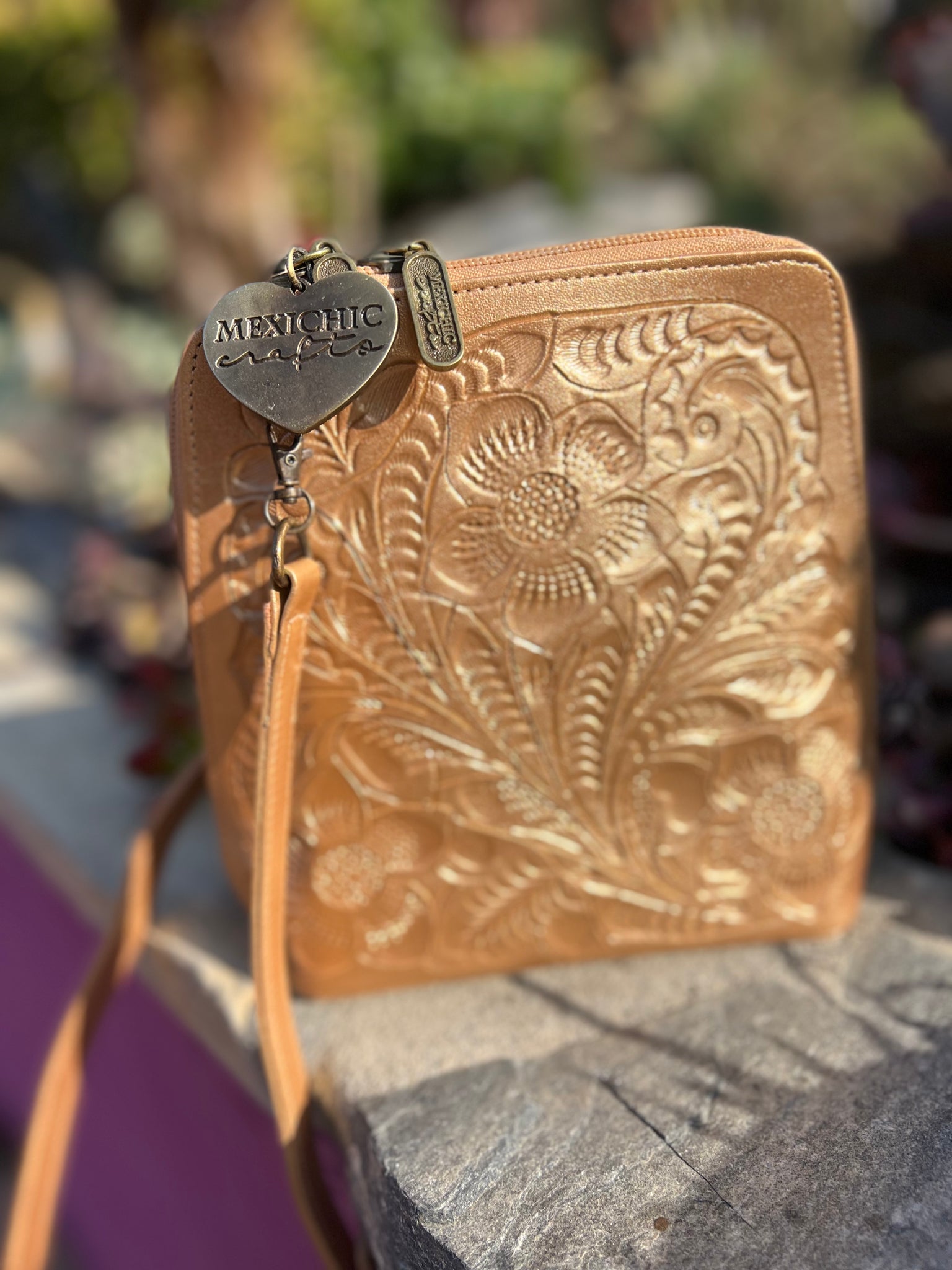 HILDA SOLIS is hand tooled, lined with suede. Opens wide and comfortably. Inside middle secure zipper compartment. Back zipper access pockets. Adjustable strap. .
