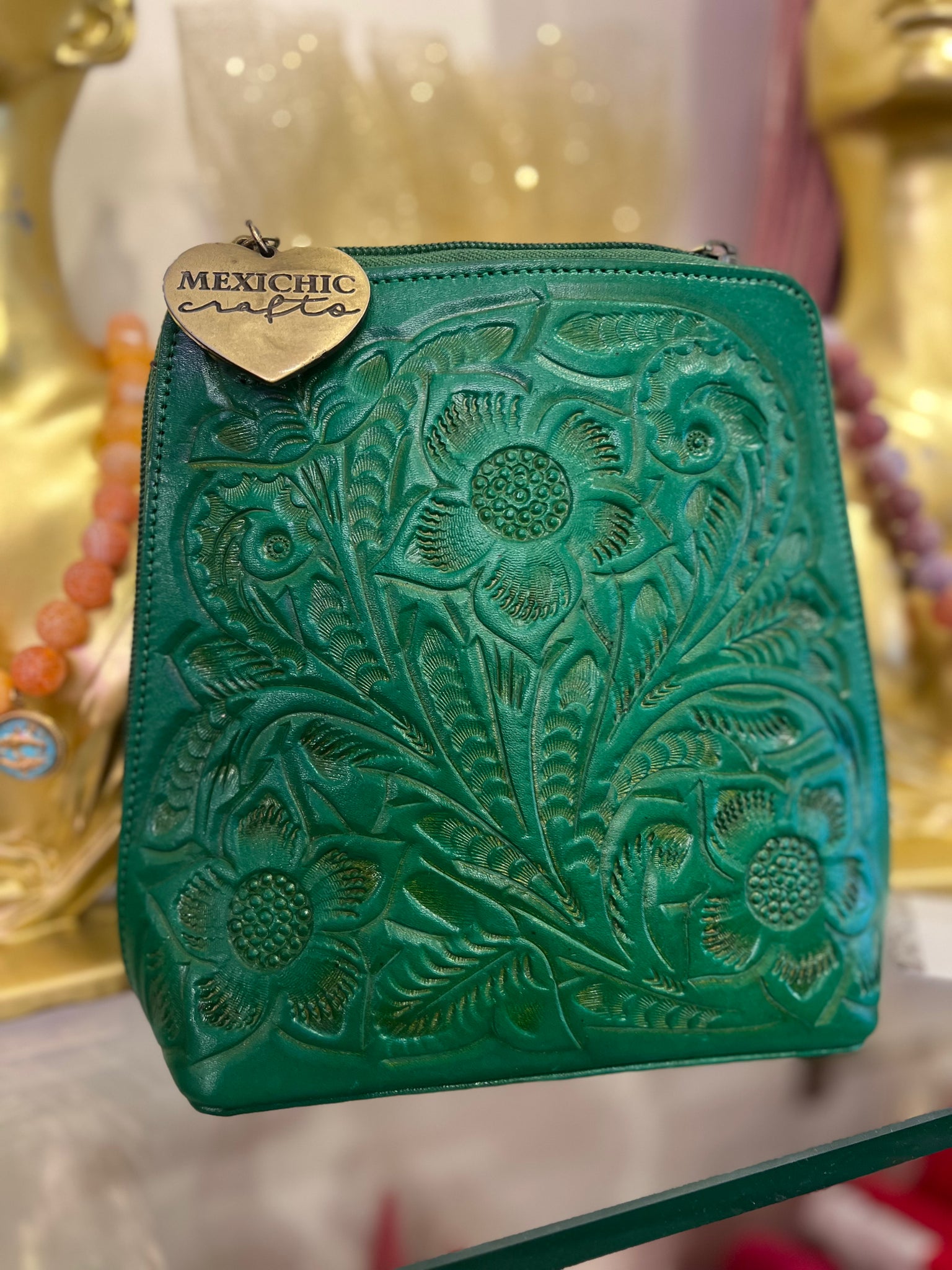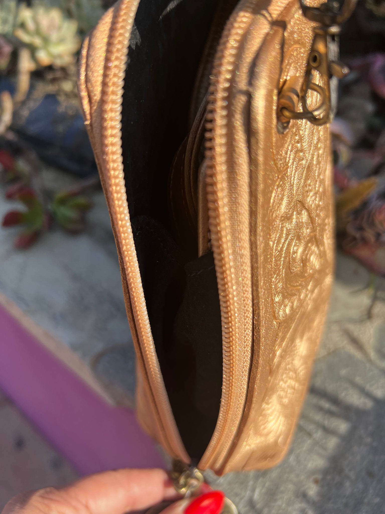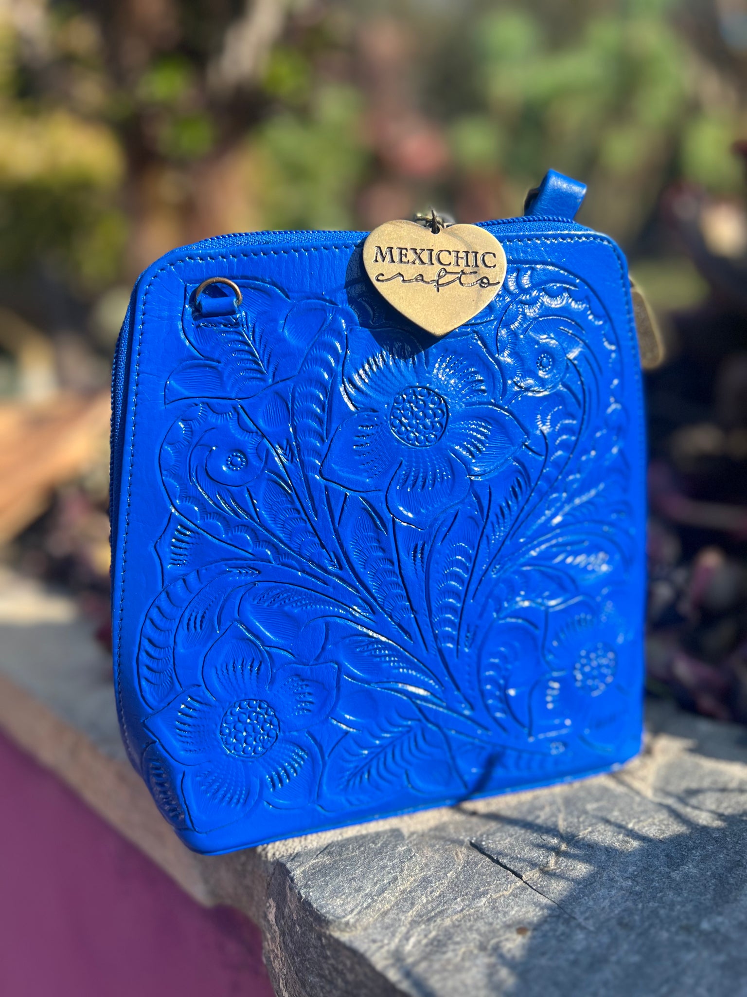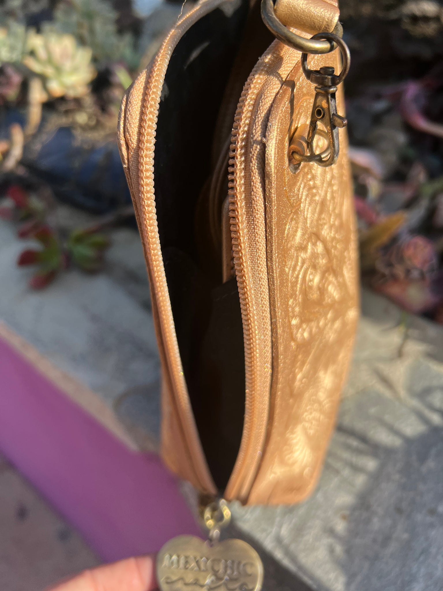 HILDA SOLIS is hand tooled, lined with suede. Opens wide and comfortably. Inside middle secure zipper compartment. Back zipper access pockets. Adjustable strap. .