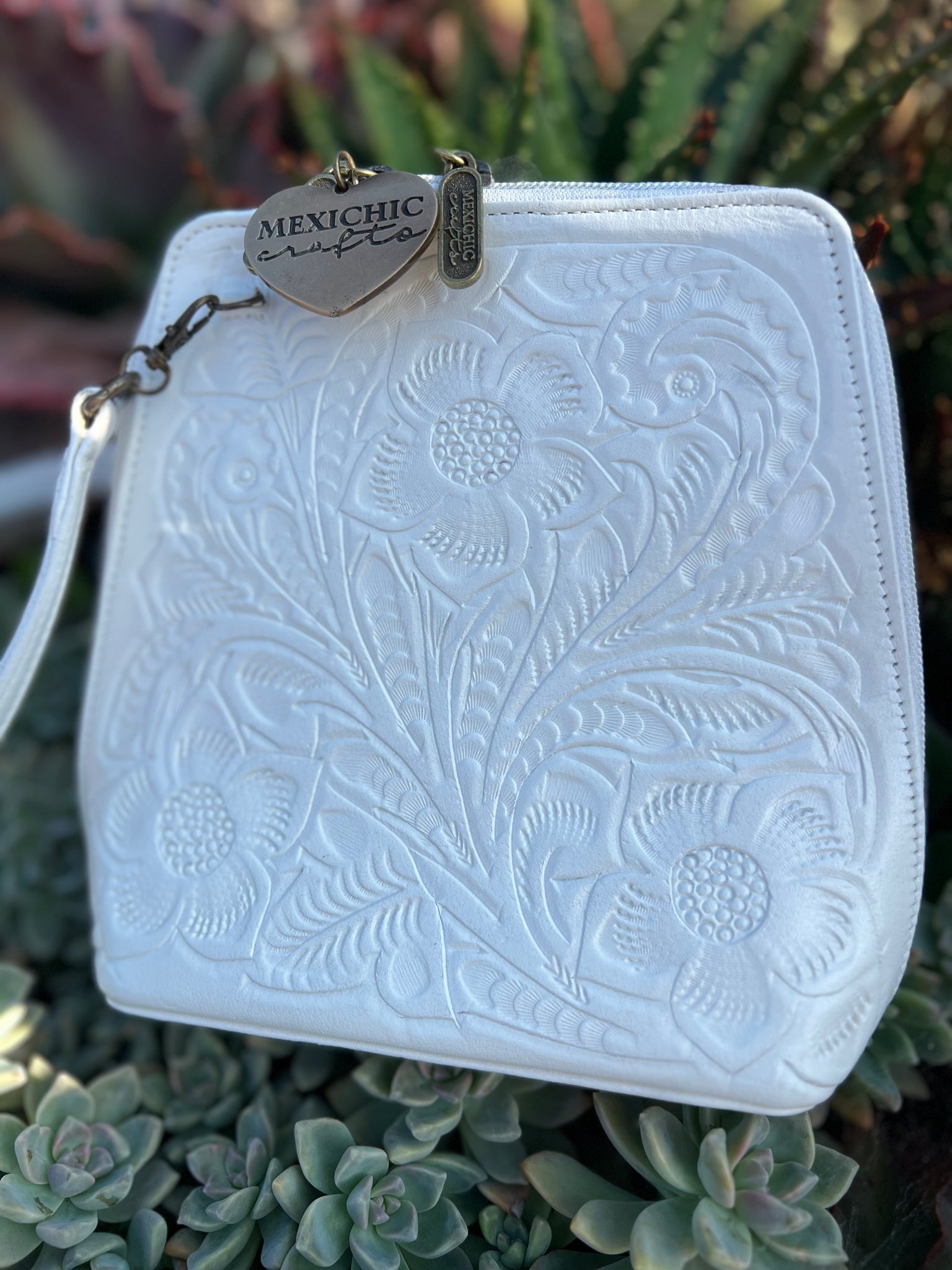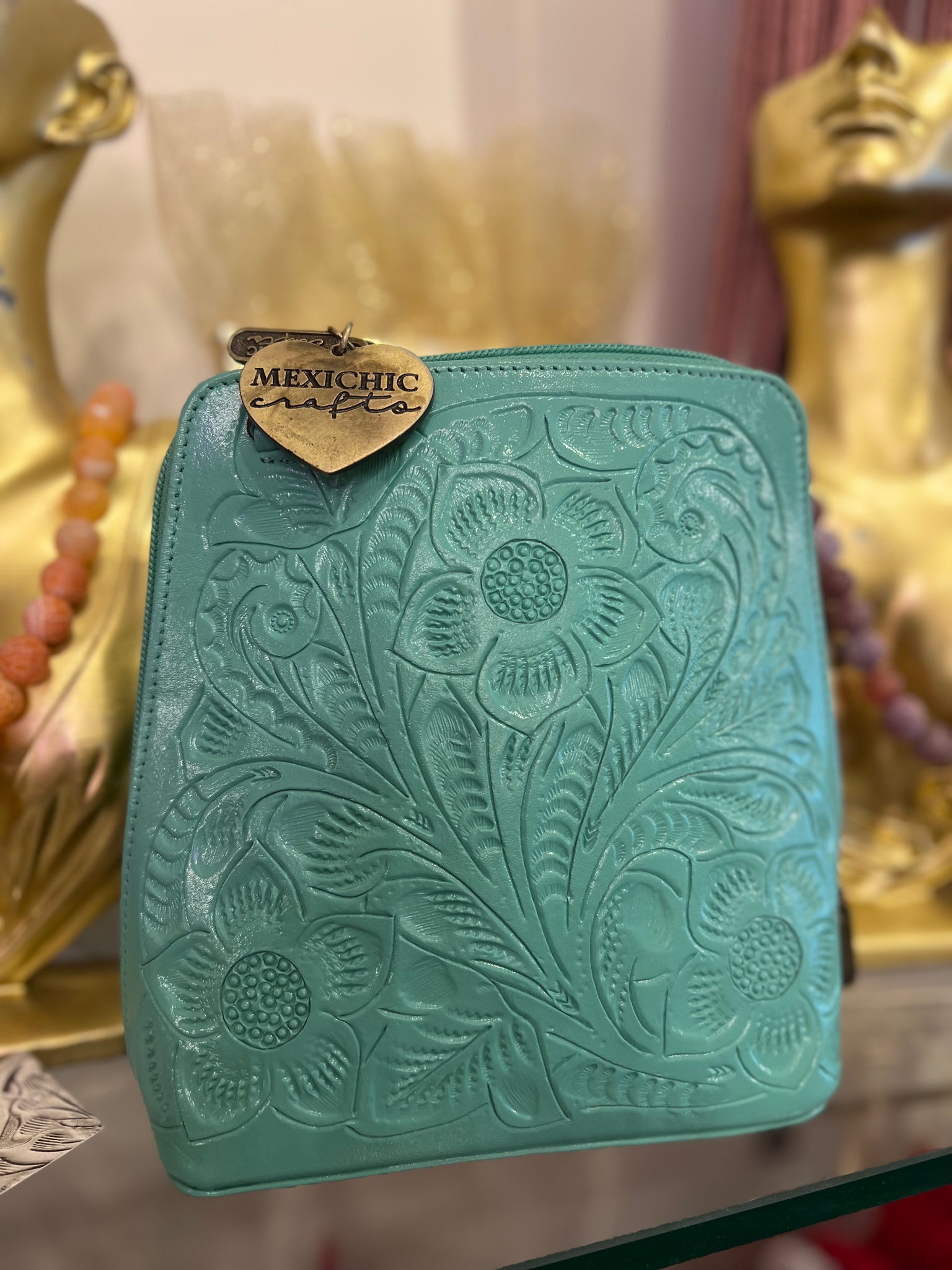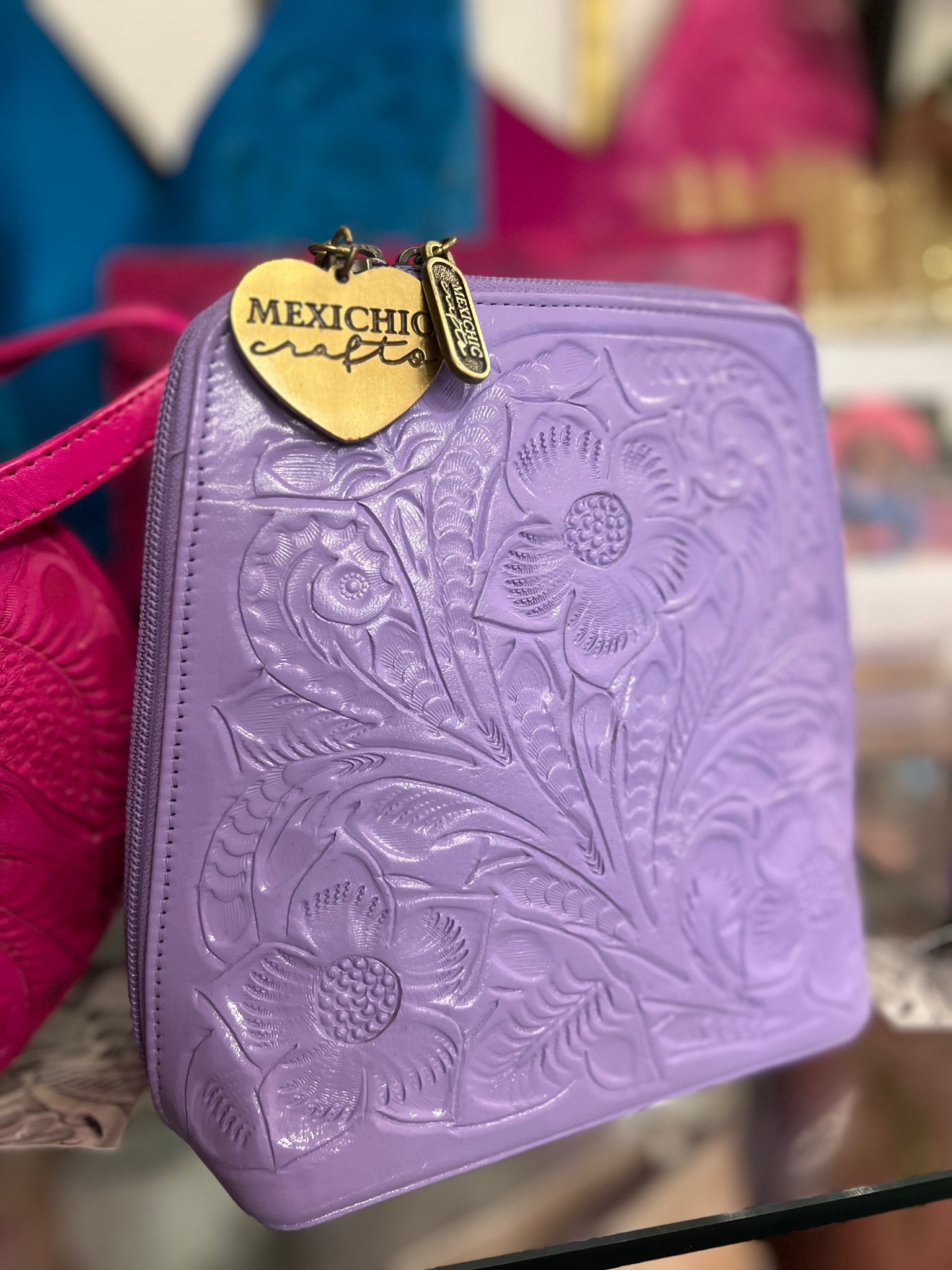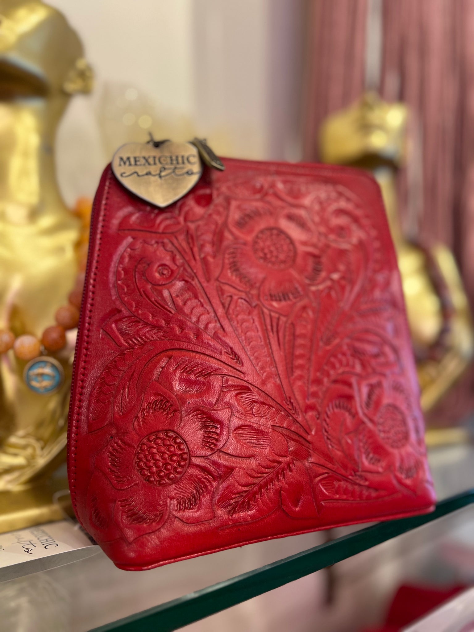 HILDA SOLIS is hand tooled, lined with suede. Opens wide and comfortably. Inside middle secure zipper compartment. Back zipper access pockets. Adjustable strap. .
