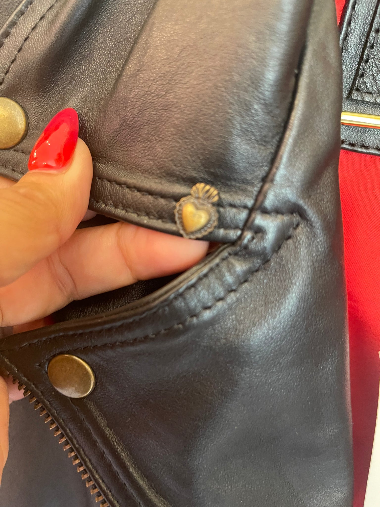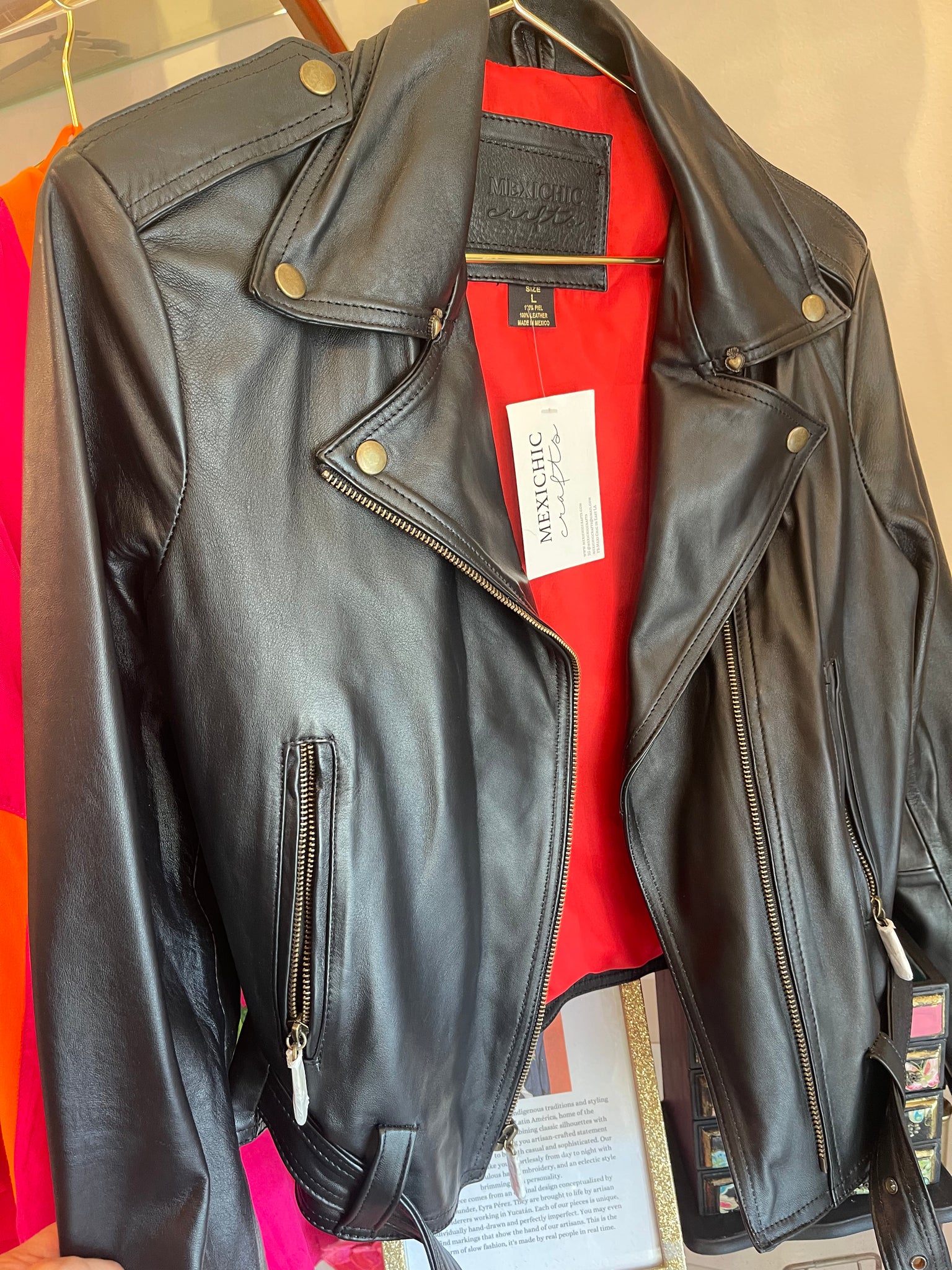 Mexi-Moto genuine lambskin leather biker luxury style lightweight jacket with red interior lining. Brass sacred heart stud rivets and hardware. Our Mexi-moto lambskin is extremely supple, buttery and soft to the touch.