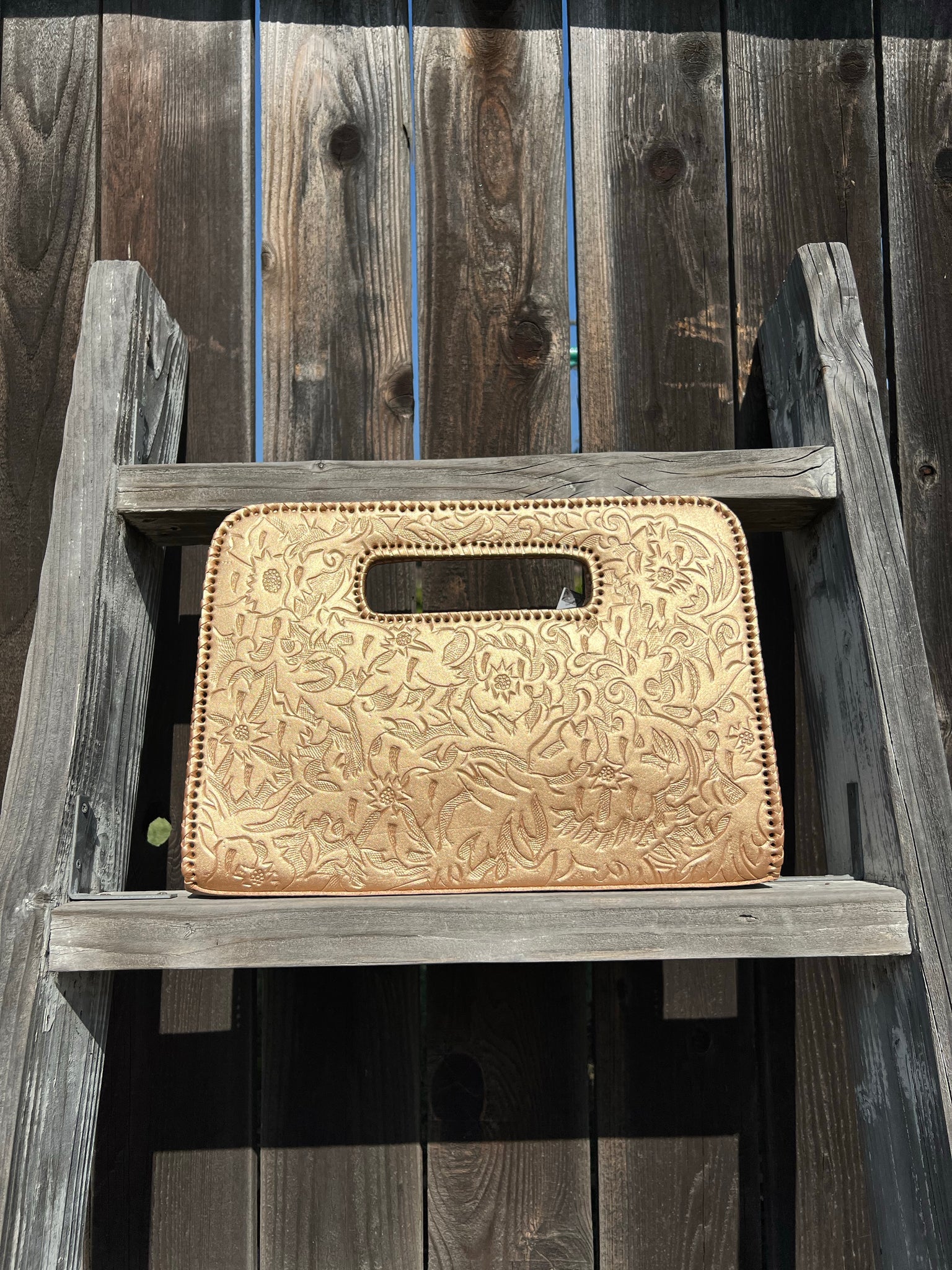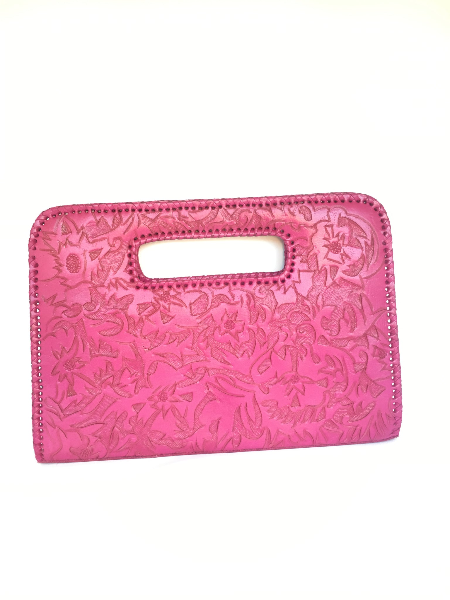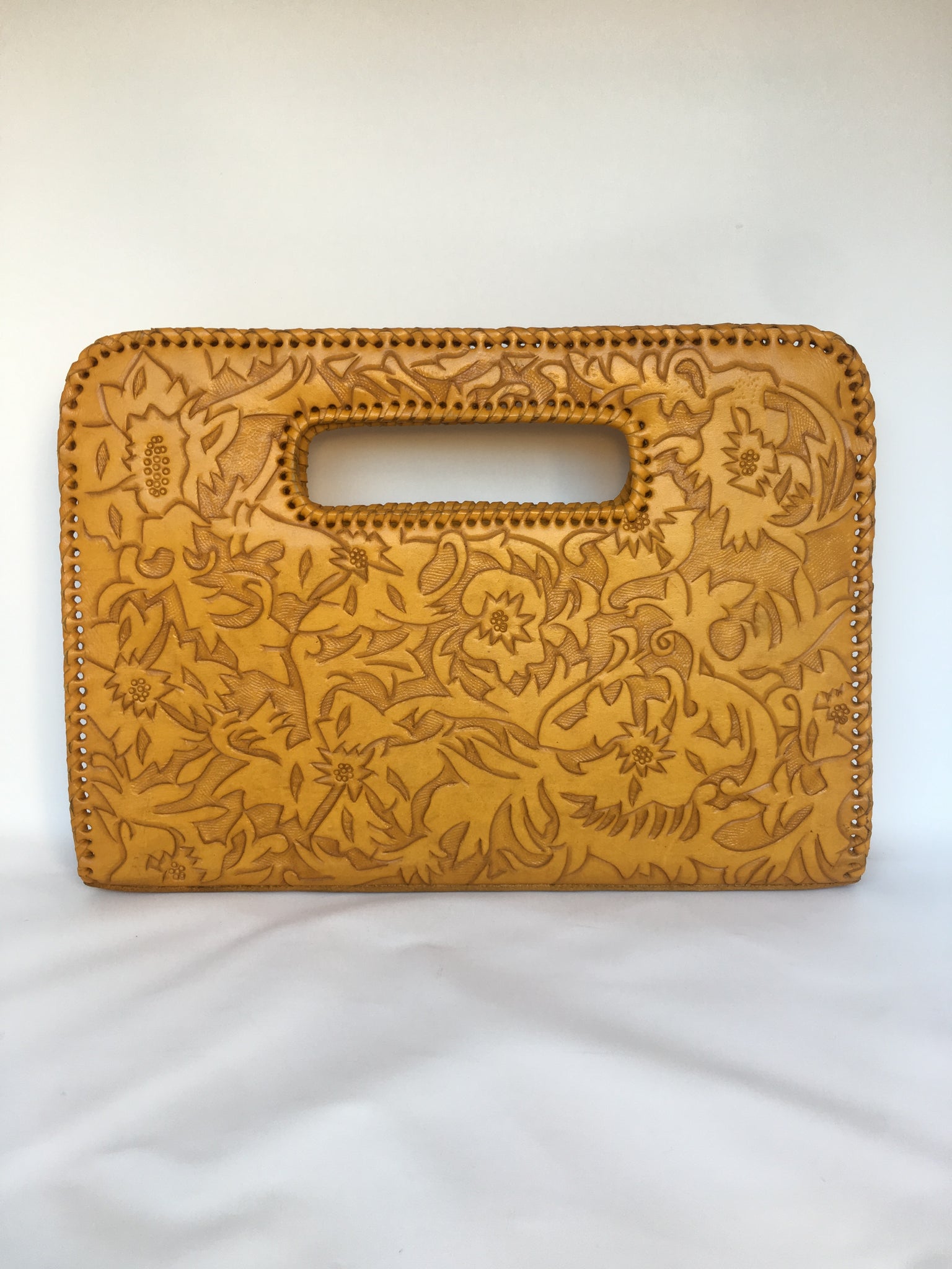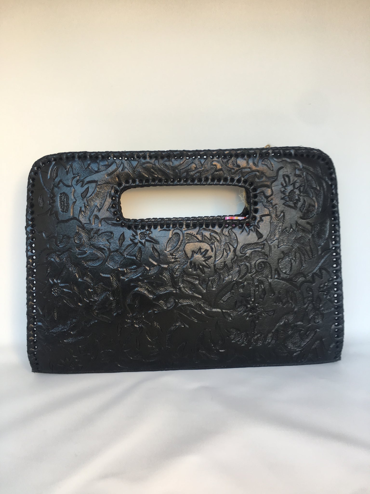 Genoveva is a modern. Ivy and flower detailed tooling on modern large clutch. Lined with suede. Three compartments fits smart pad.