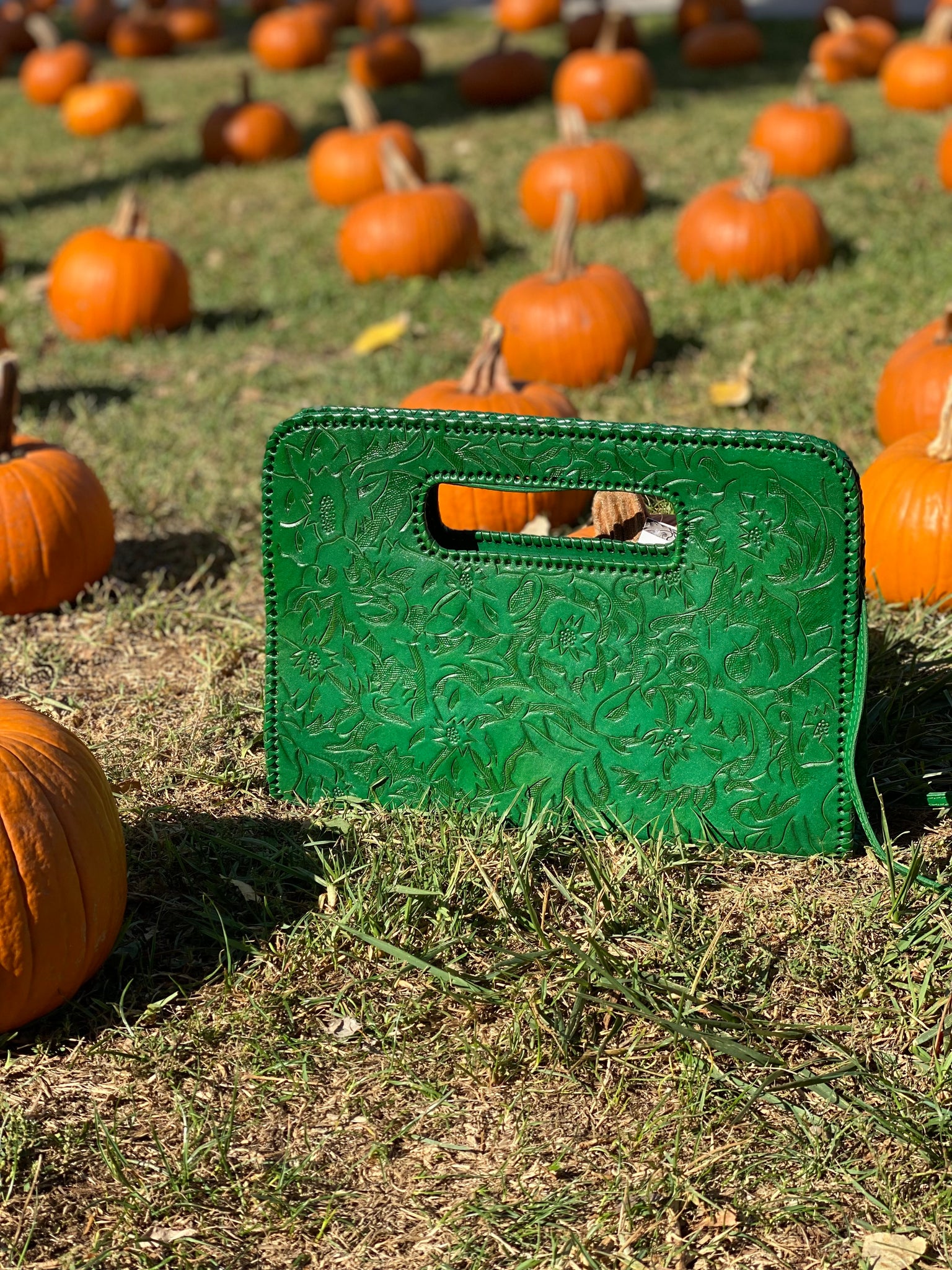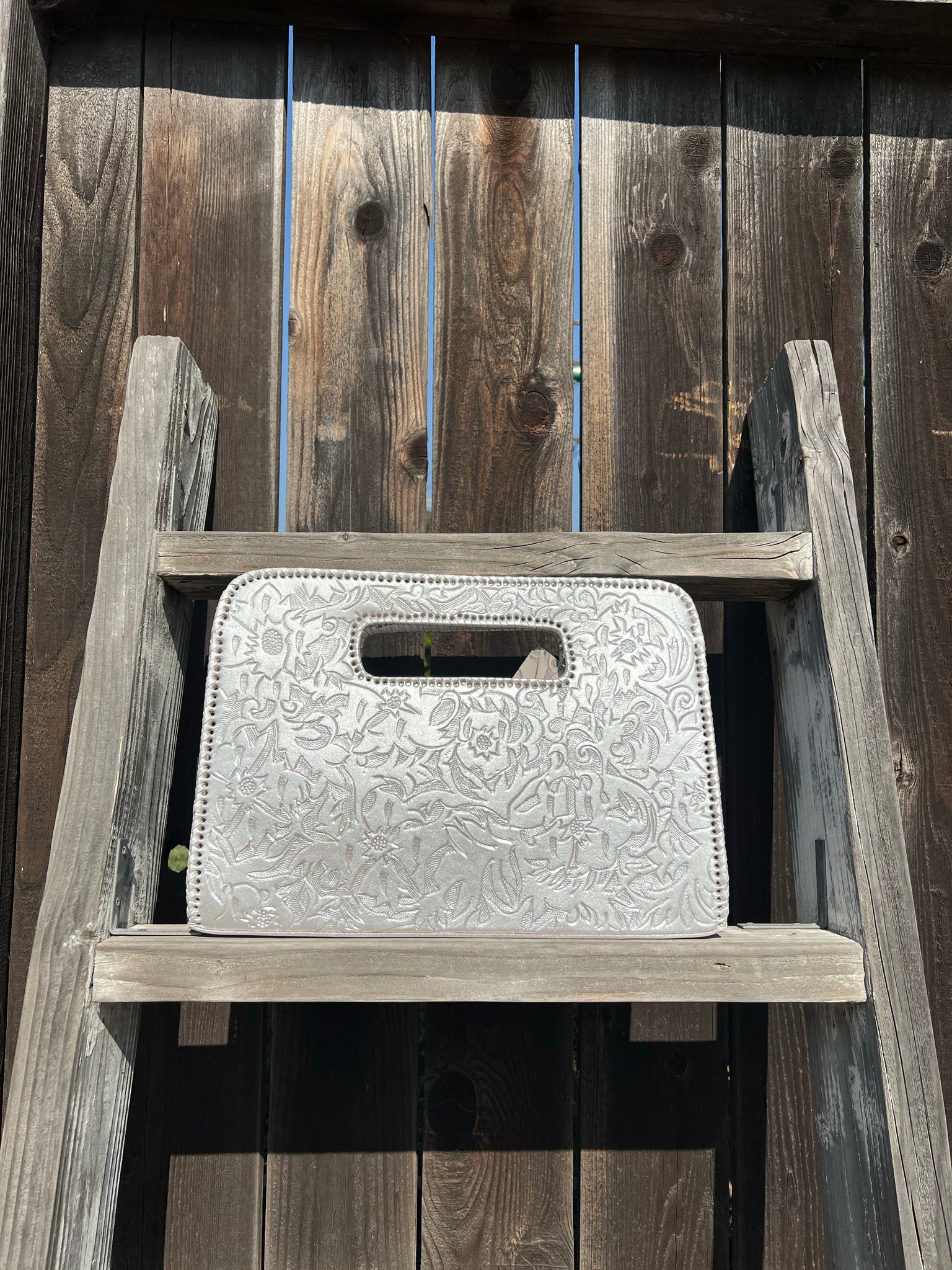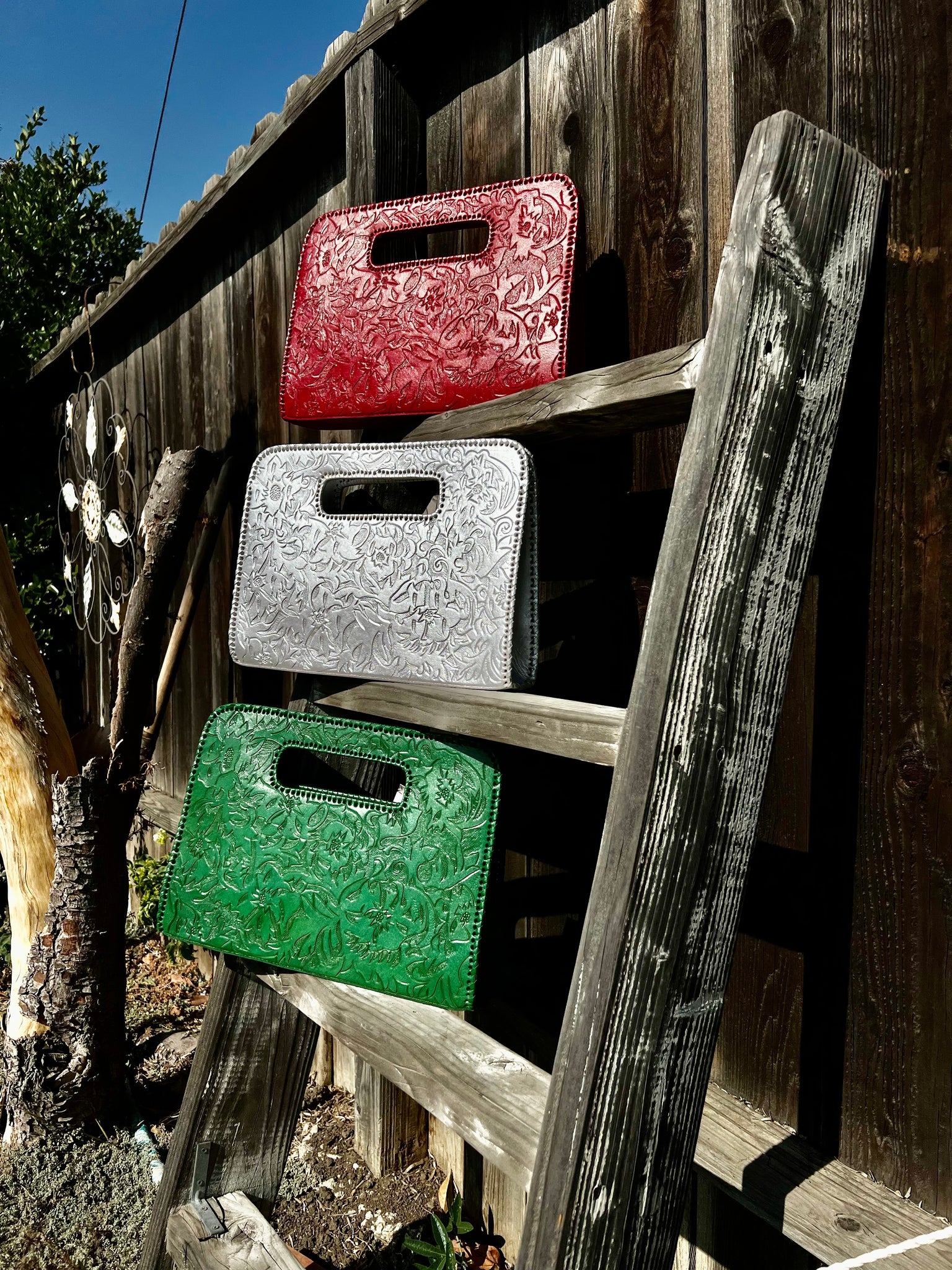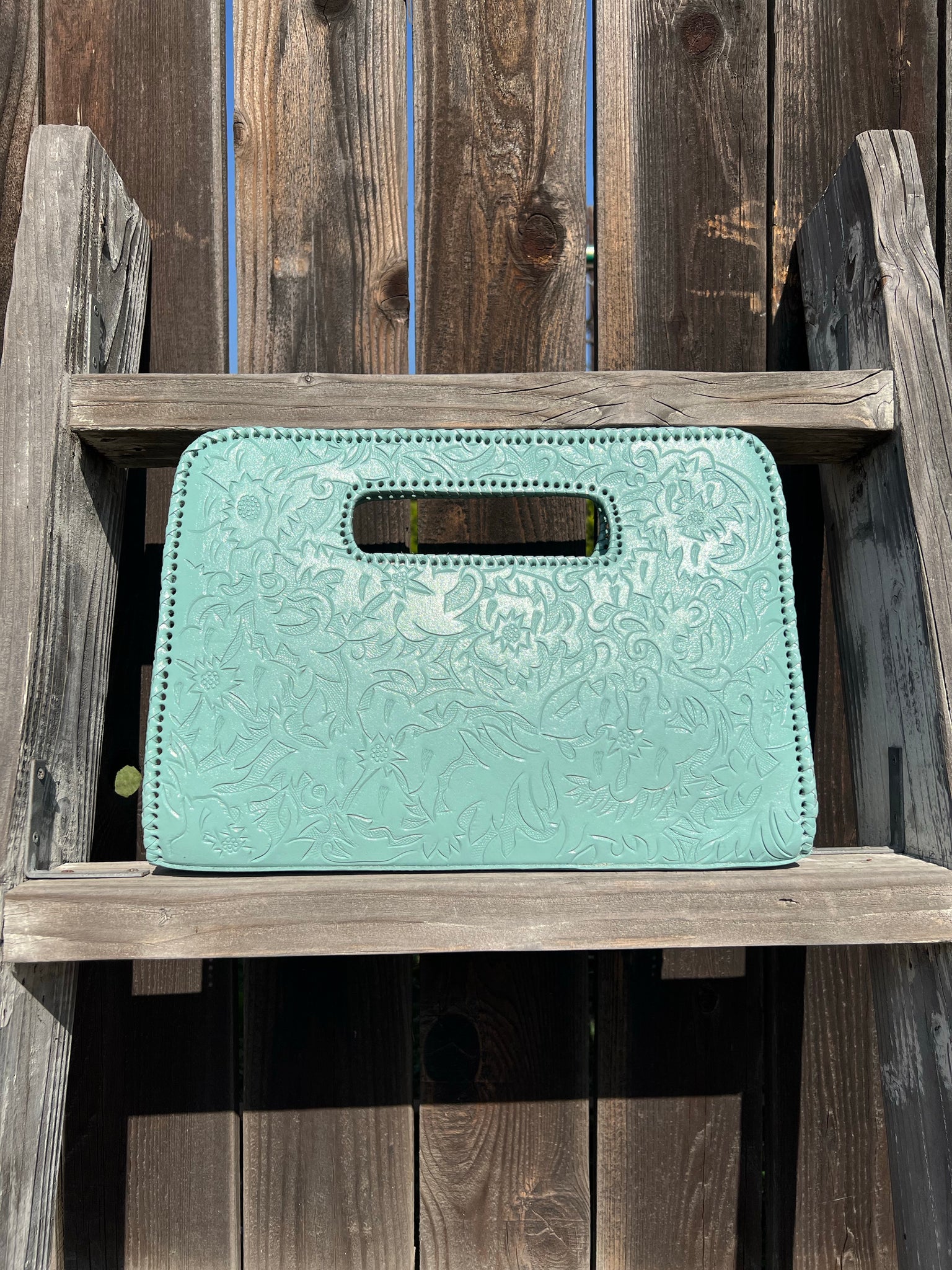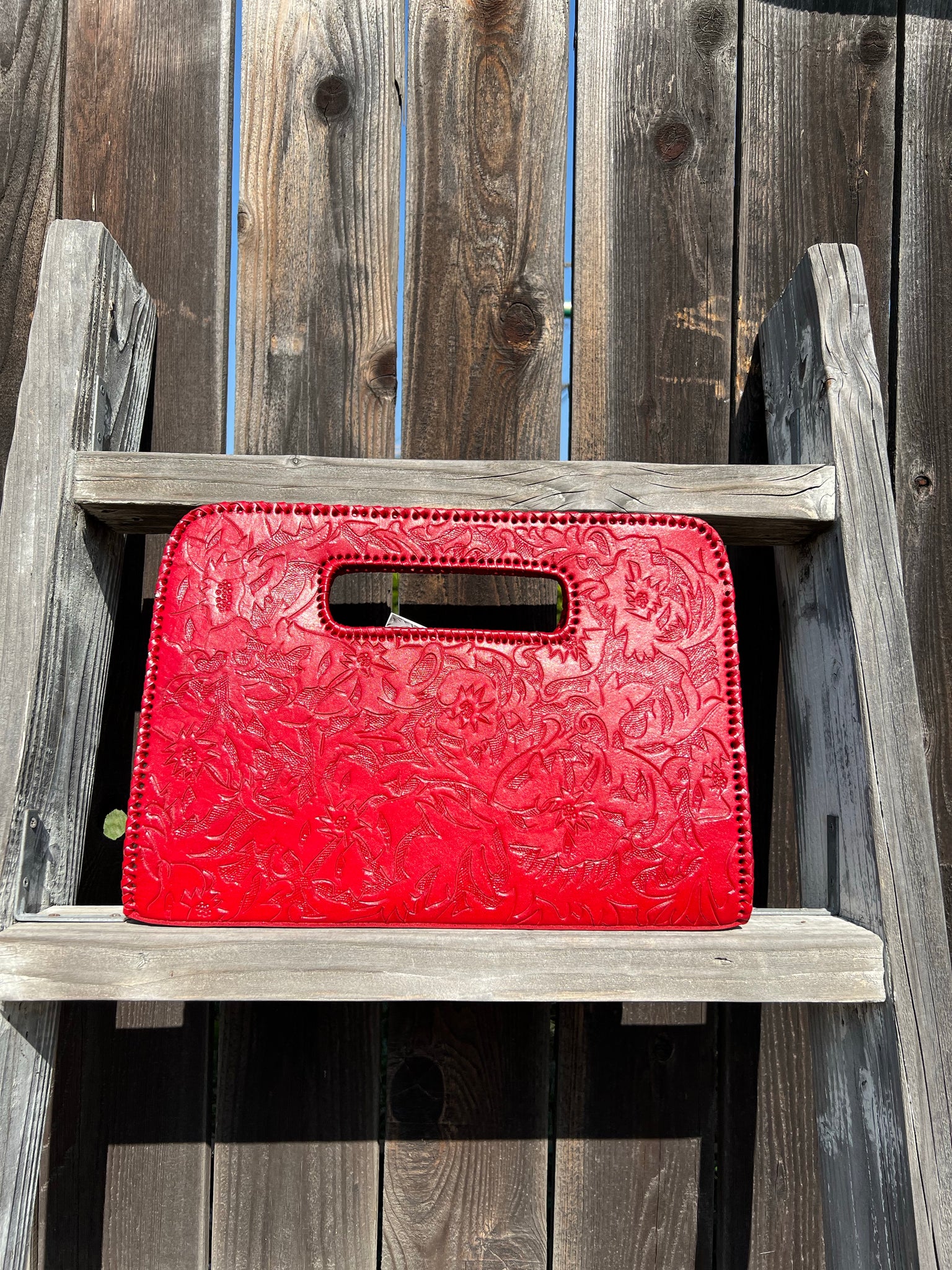 Genoveva is a modern. Ivy and flower detailed tooling on modern large clutch. Lined with suede. Three compartments fits smart pad.